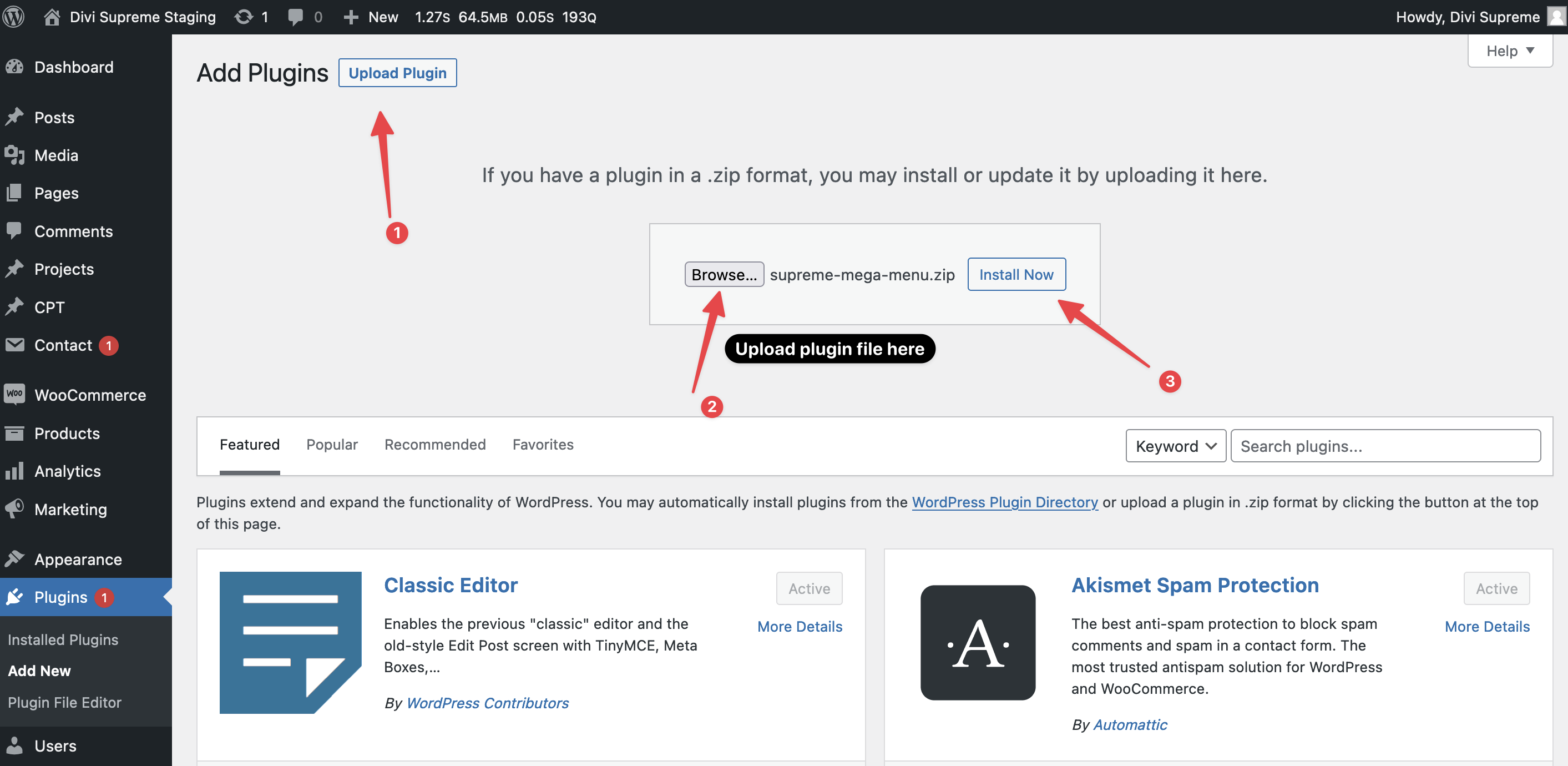 Now click the Upload button at the top and choose the "supreme-mega-menu.zip" file and click the Install button.