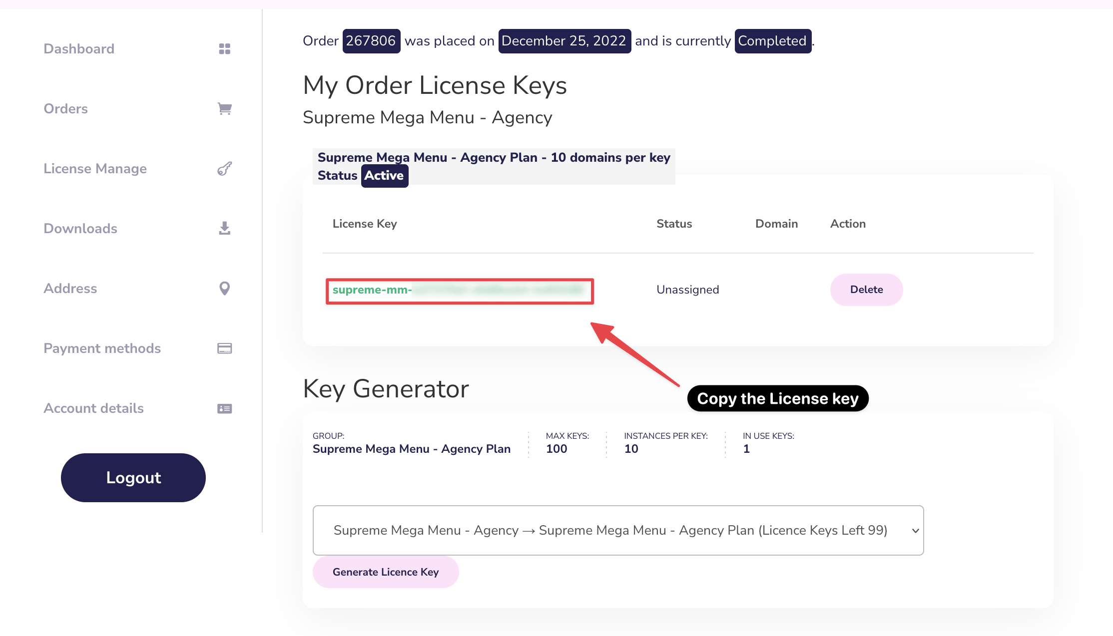 Now, this step is important, you'll need to add the License key to receive regular updates. For that, go to your Divi Supreme Account Area -> Orders -> License Manage -> and copy the License key.